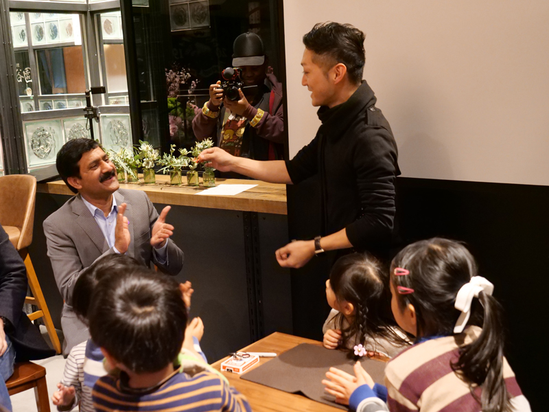 割れんばかりの拍手でジアウディンさんを会場にお迎えすると、まずは子供達の緊張をほぐすために SDAメンバーの魔法つかい K O J I氏による魔法。子供たちと一緒にジアウディンさんも食い入るようにご覧になり、魔法のプレゼントを受け取ると満面の笑みを浮かべていらっしゃいました。