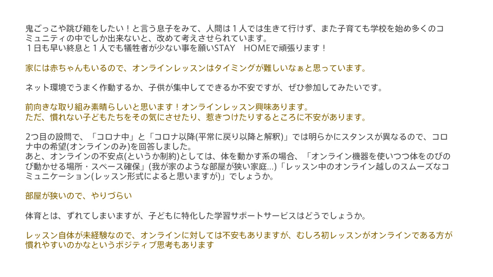 学校が休校となり家で悶々とする機会が増加している現在、オンライン体育が「児童虐待の防止」「運動不足の解消」「体力・免疫力低下の防止」に貢献できれば良いと思い、アンケート調査を行いました。