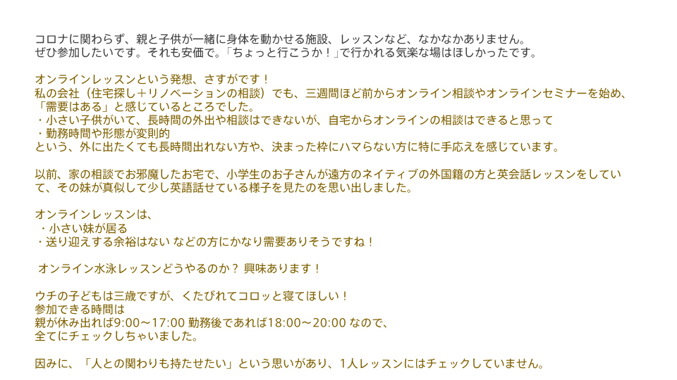 家族でイエナカで過ごさざる得ないこの時期、子どもたちが運動不足にならないようと水泳教室をやっているメンバーの菅原優さん(swimmy株式会社CEO)発案のもと【自宅で教えてほしい運動は何か】を切り口にしたアンケート取ってみました。15分くらいで読める内容ですので、お子様と過ごす際の参考になればと思っています。