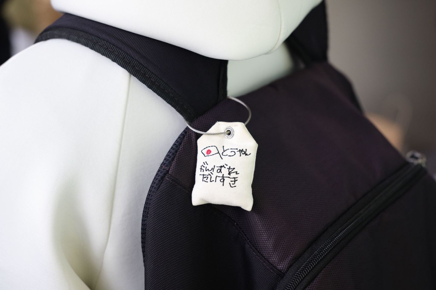 インタビューを終え、帰り際の宇田選手の背中には世界でたった一つのお守りがキラリと光っていました。
